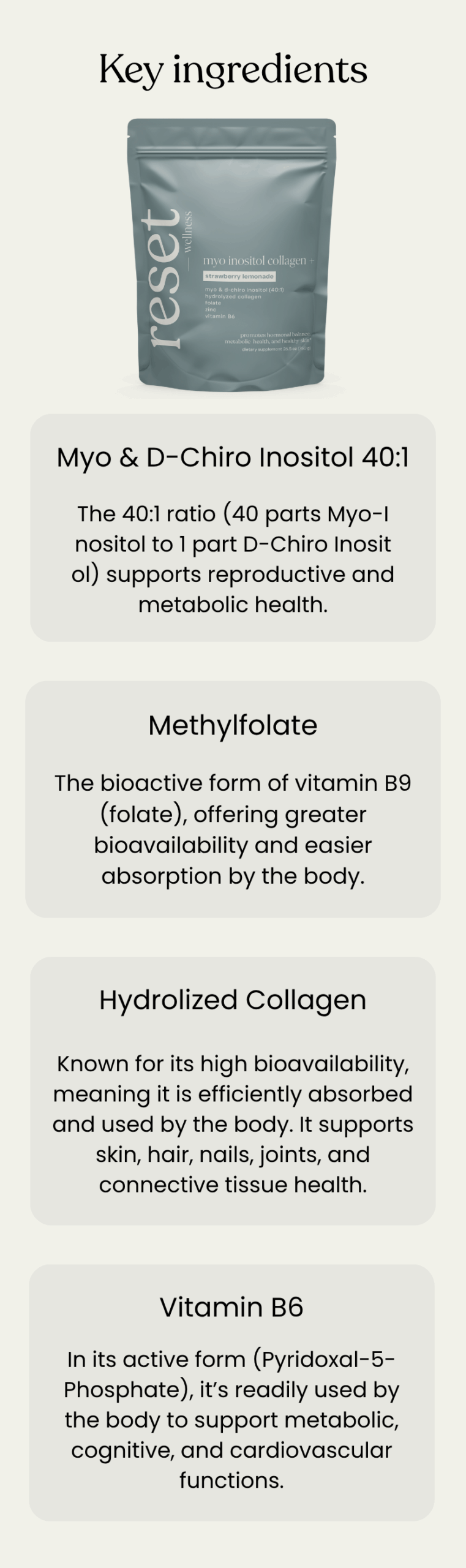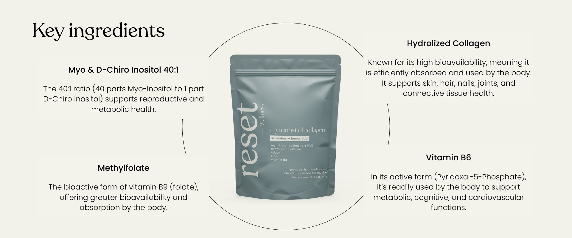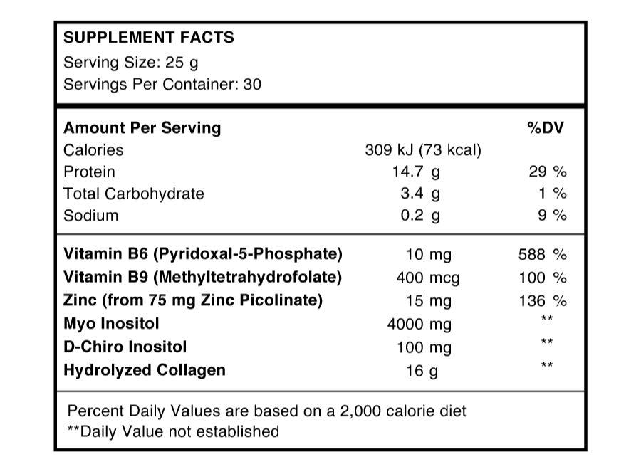 Myo Inositol Collagen+ blends 2,000 mg of Myo-Inositol and 50 mg of D-Chiro-Inositol (40:1 ratio) with 16 g of premium hydrolyzed collagen for added satiety and daily energy.