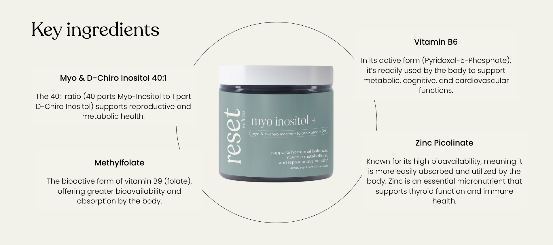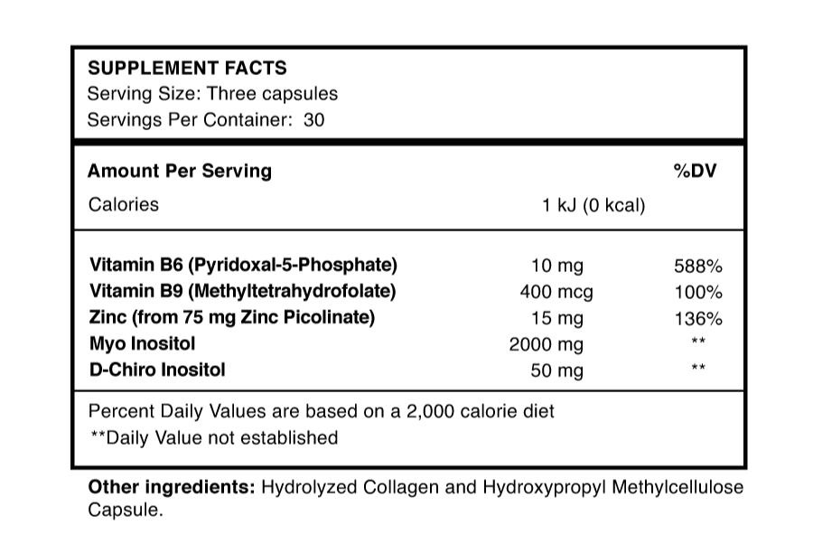 Each capsule delivers 2,000 mg of Myo-Inositol and 50 mg of D-Chiro-Inositol in the clinically studied 40:1 ratio, plus methylfolate, Vitamin B6, and zinc to support glucose metabolism, skin health, and reproductive function.*
